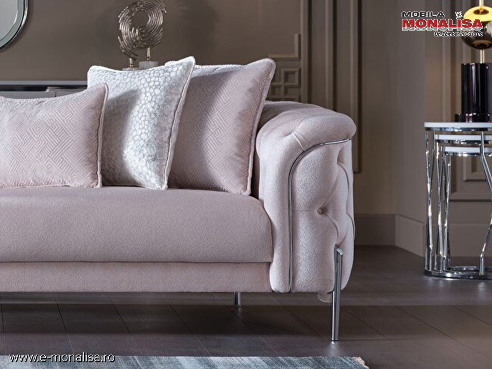 - Picioarele din metal cu finisaj crom argintiu si insertia de contur prezenta pe brate puncteaza nota de lux modern si eleganta;