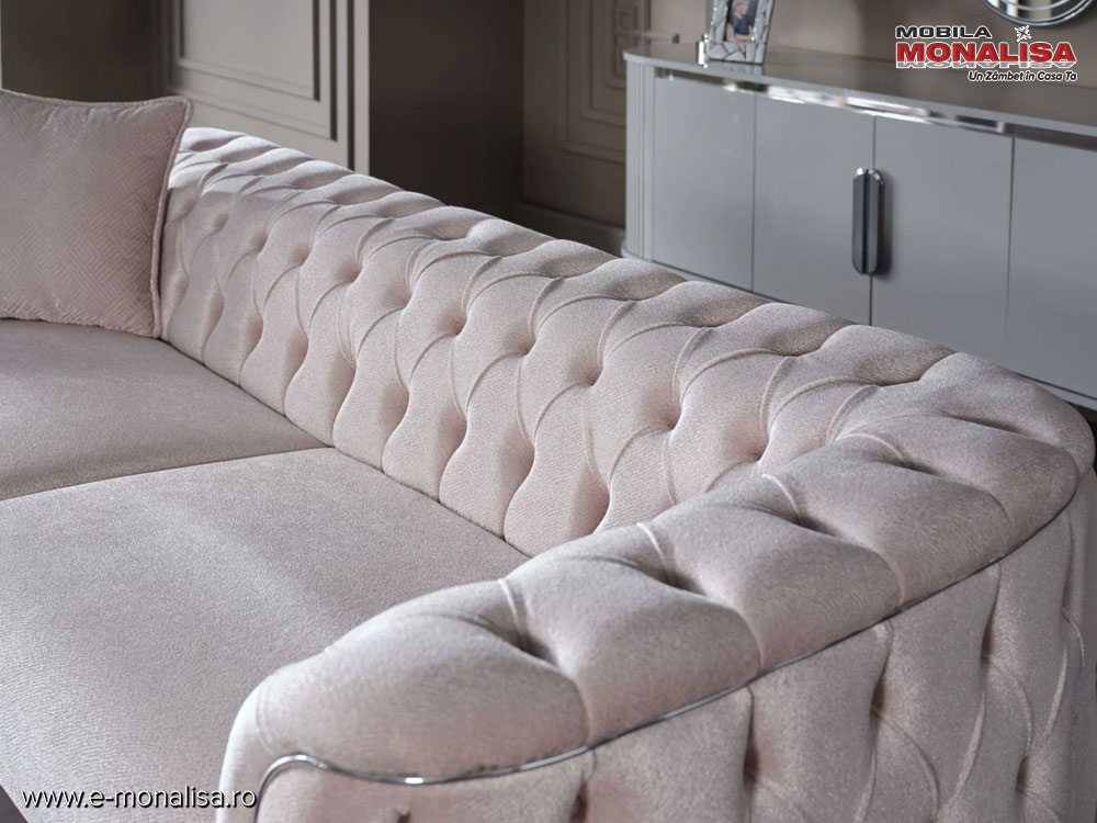 Dolce este o canapea eleganta moderna din catifea crem fina pentru amenajare living de lux pe stil nobil chesterfield.