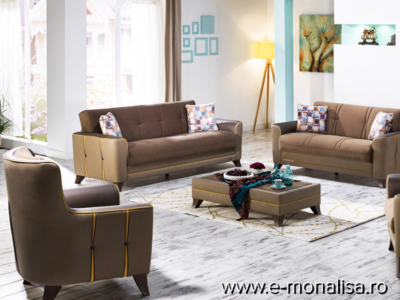 Tapiteria din stofa pe sezut si spatar combinata cu pielea ecologica prezenta pe brate asorteaza in culoarea cafelei iar insertiile luminoase inveselesc atmosfera din livingul sau sufrageria ta.