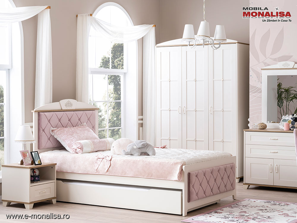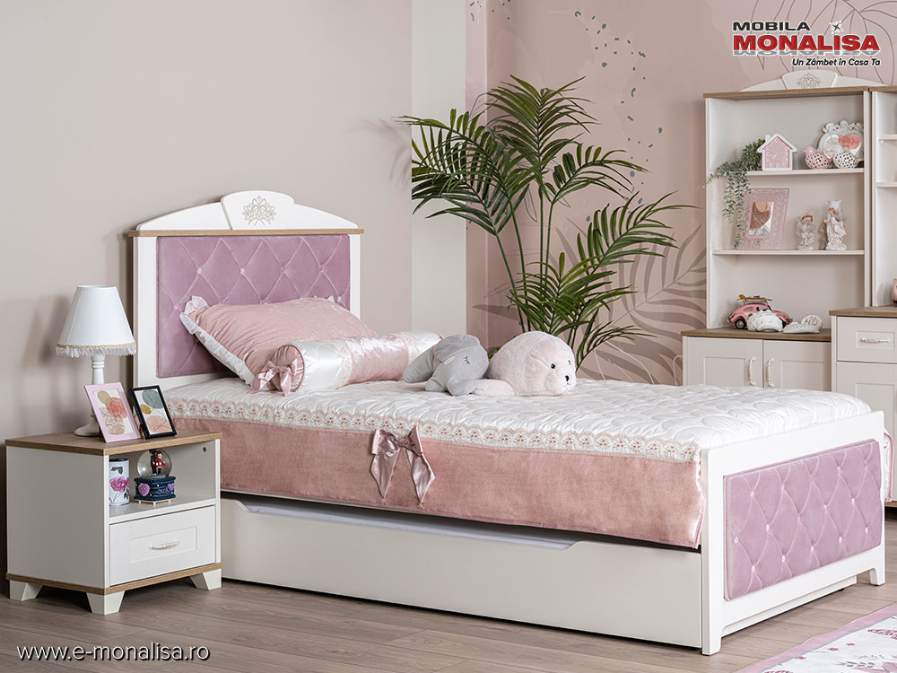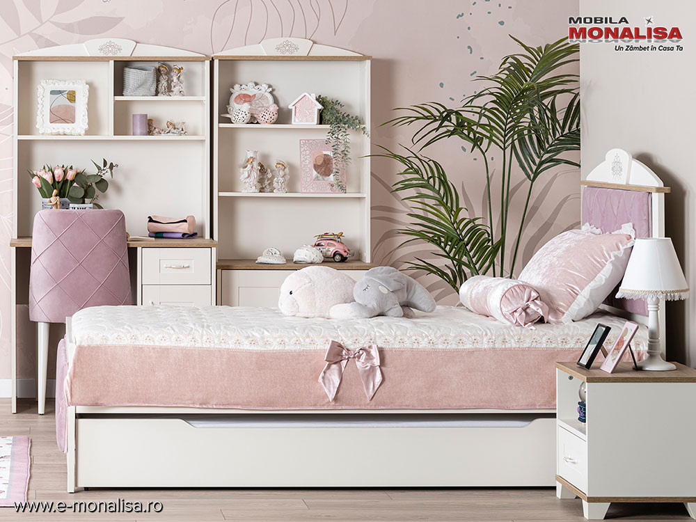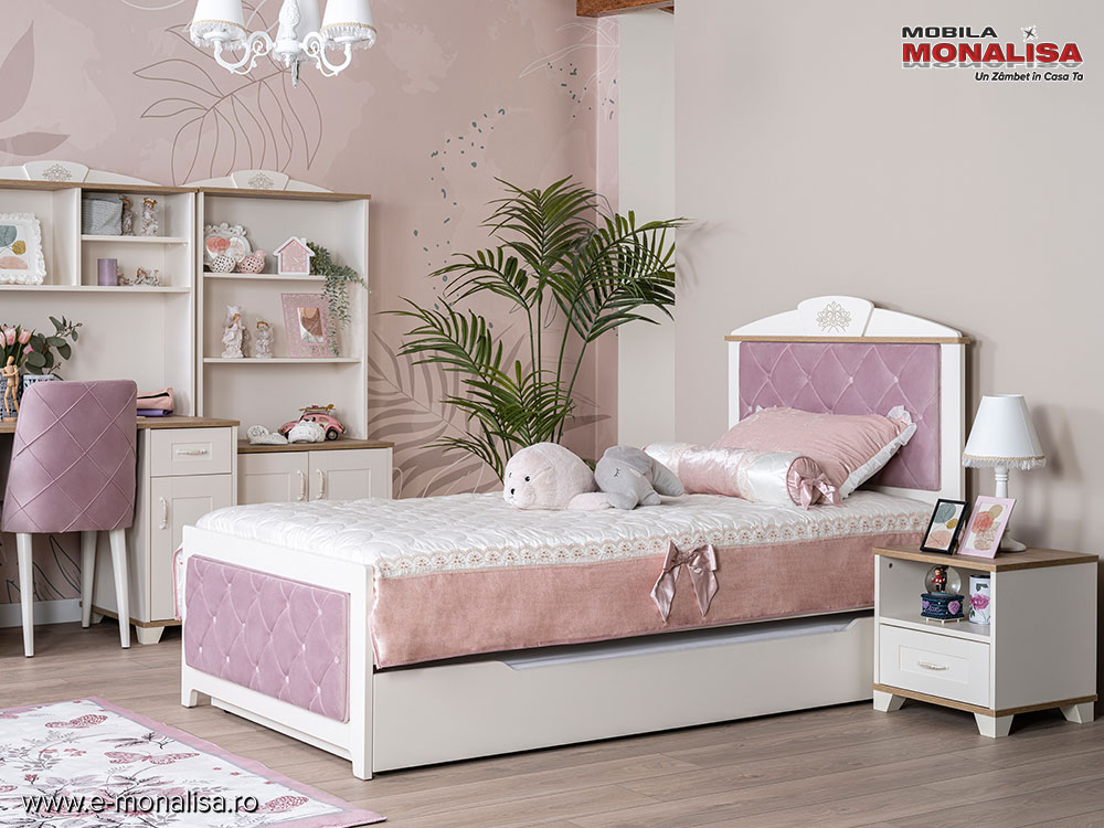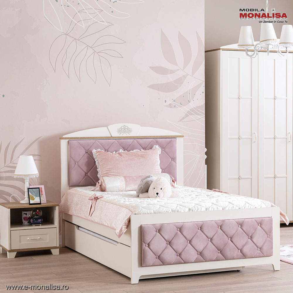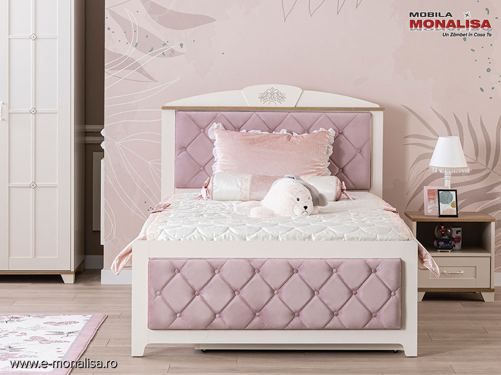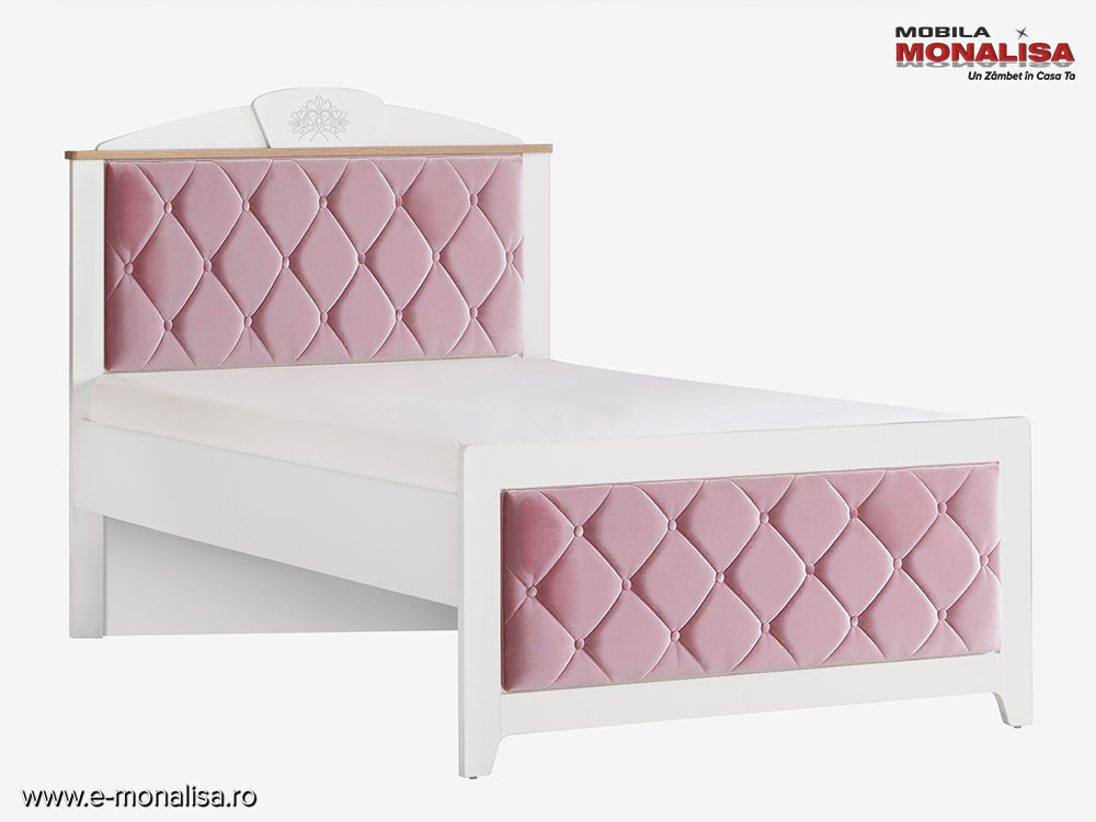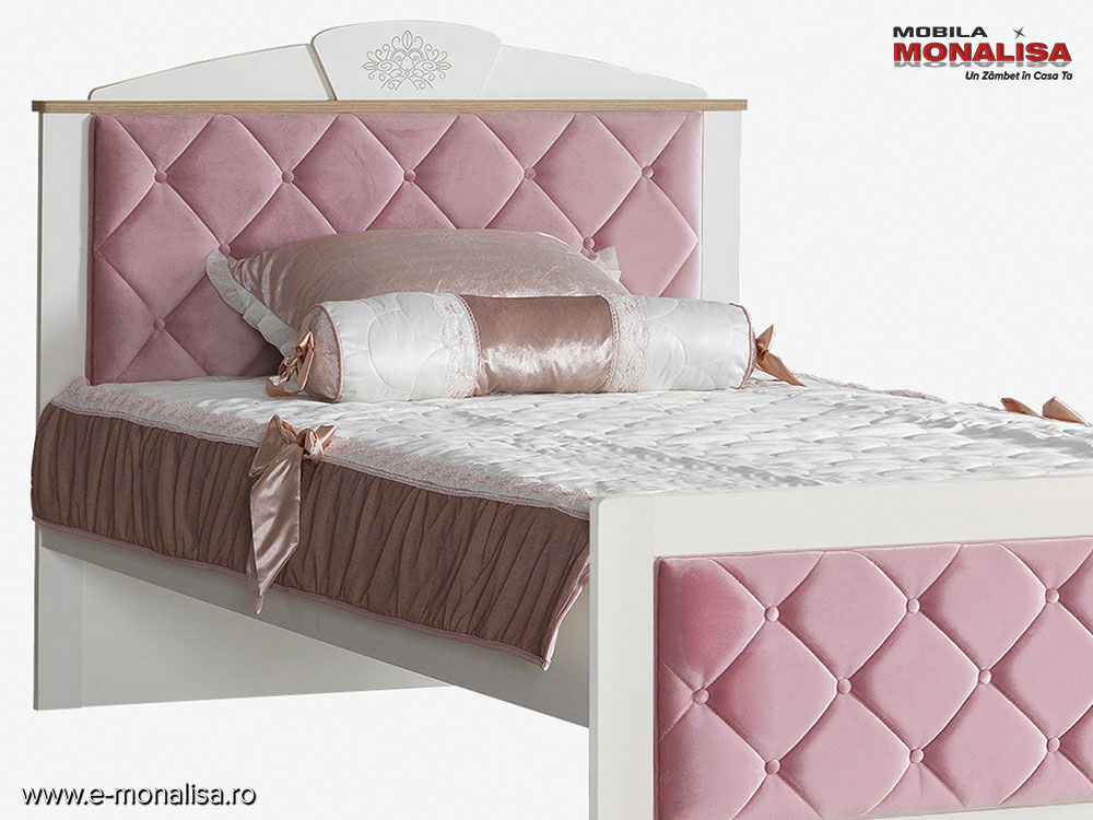 Mobila MONALISA | Pat Alb mat 120x200cm Fete New Frezya ❤️ Pret cu Tablii Catifea roz