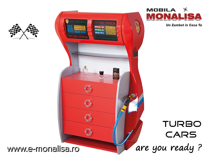 - comoda statie de benzina - cu 4 sertare, polita si spatiu de depozitare in partea superioara - design Turbo Cars rosu