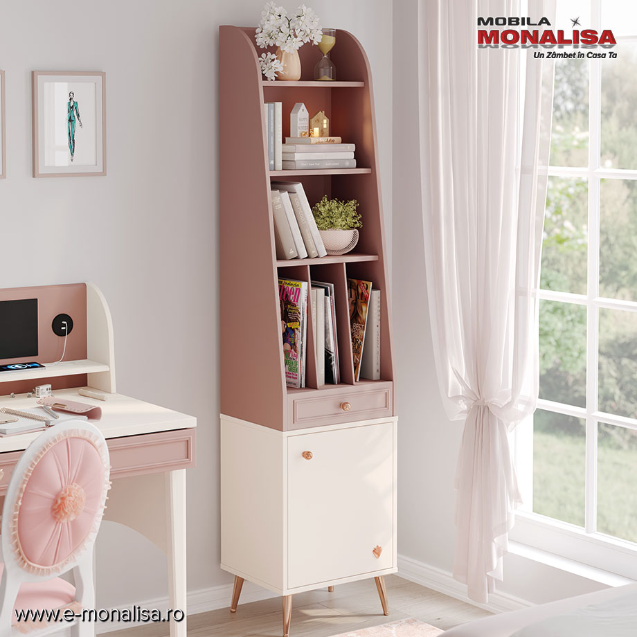 - Minibiblioteca inalta / Raft pt. Birou camera tineret roz pudra Elegance – 20.84.1104.00 – polite mari + polite mici + tabla mare + incarcare USB – v2