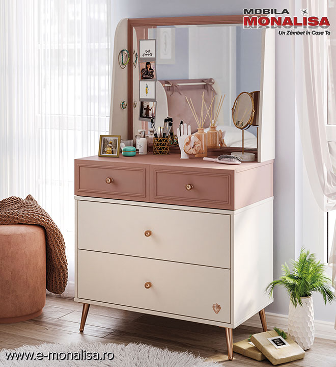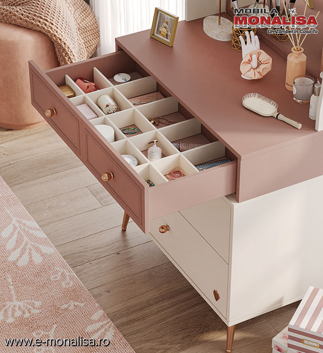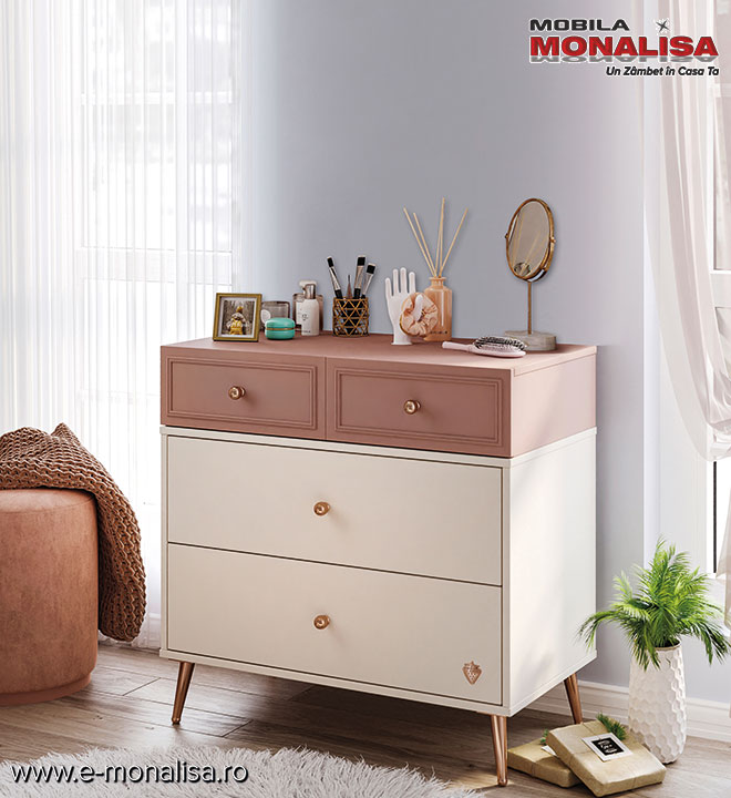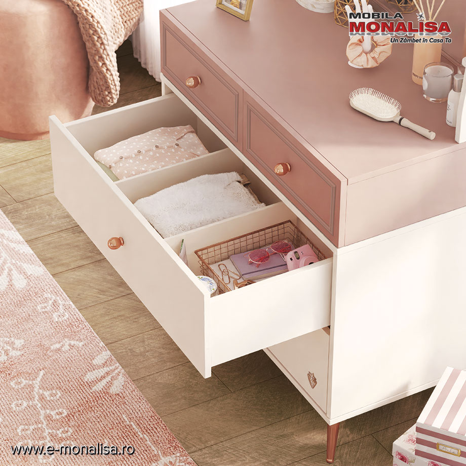 - Comoda roz pudra Elegance cu 2 sertare mari + 2 sertare mici prevazute cu organizator bijuterii – 20.84.1201.00