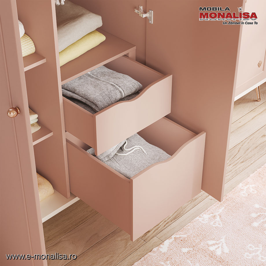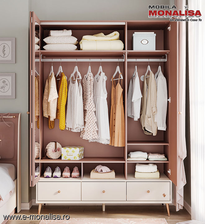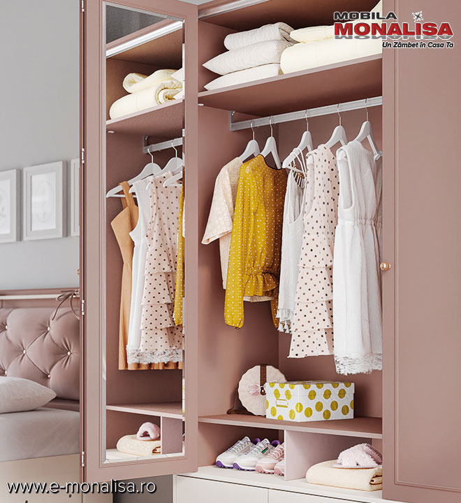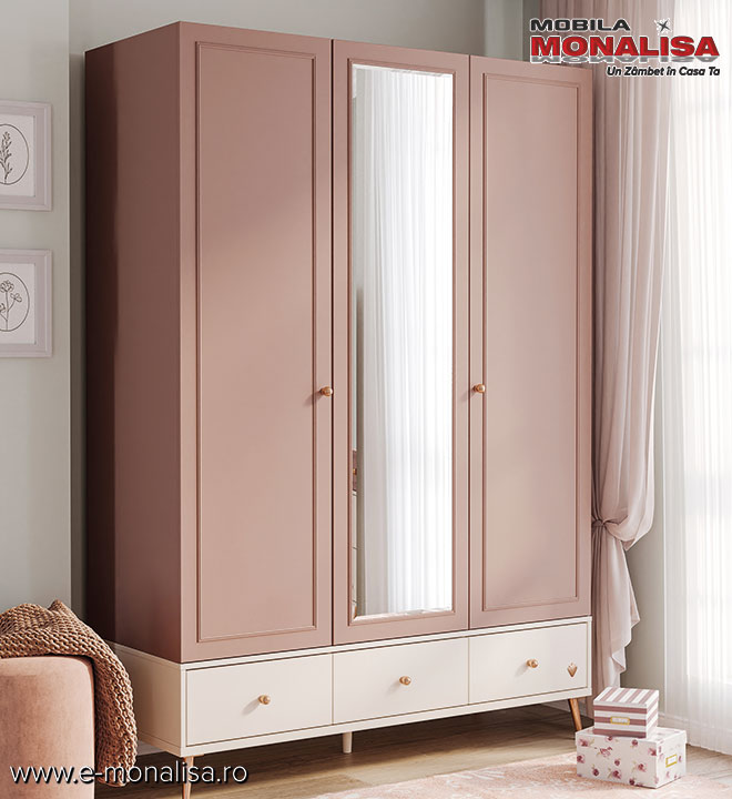 - Dulap haine cu 3 usi, 2 usi simple + 1 usa oglinda + 3 sertare Elegance roz pudra – 20.84.1002.00 – varianta buget generos, optimizare spatiu