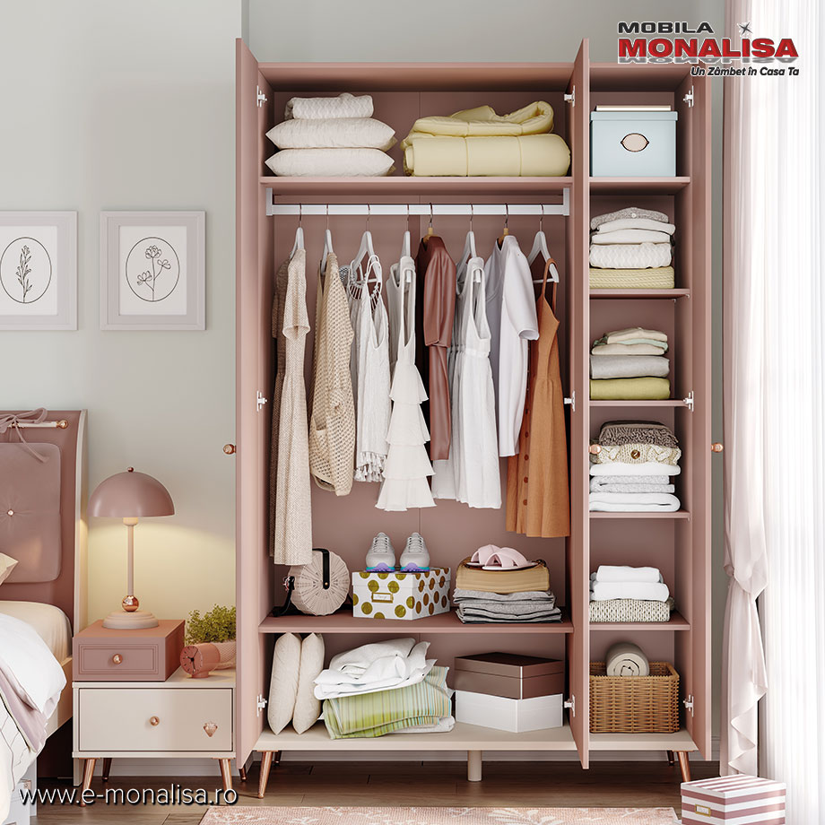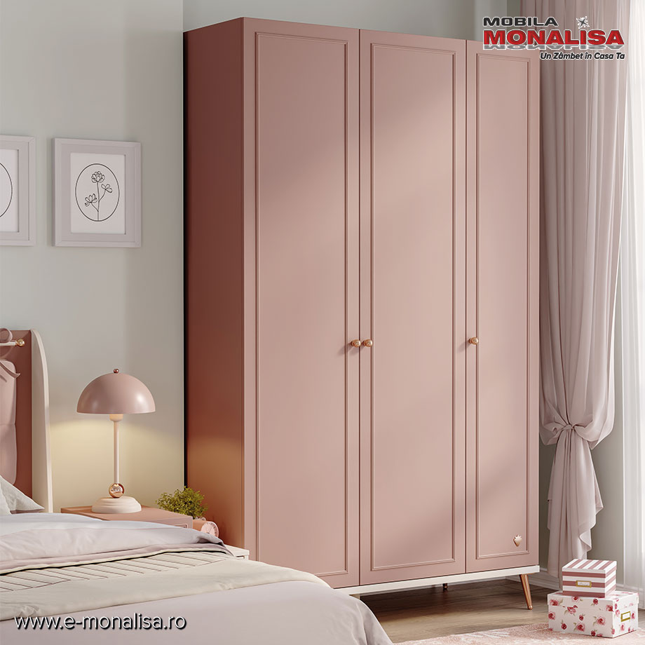 - Dulap haine cu 3 usi simple Elegance roz pudra – 20.84.1002.00 – varianta standard, buget