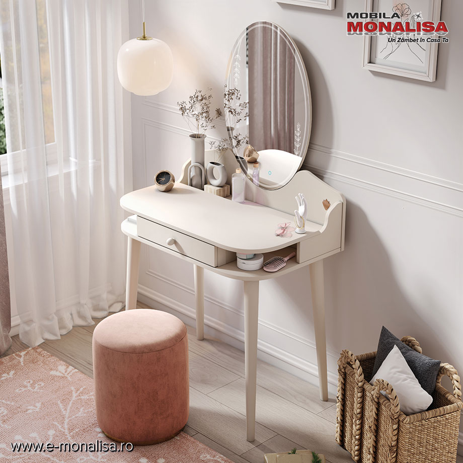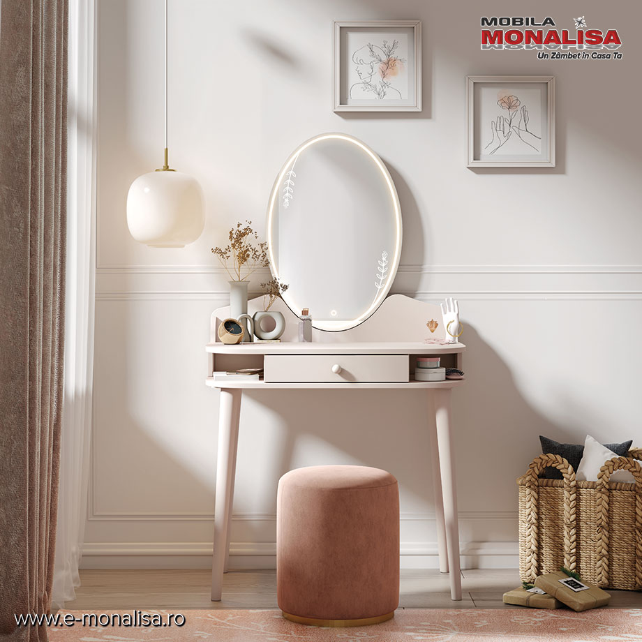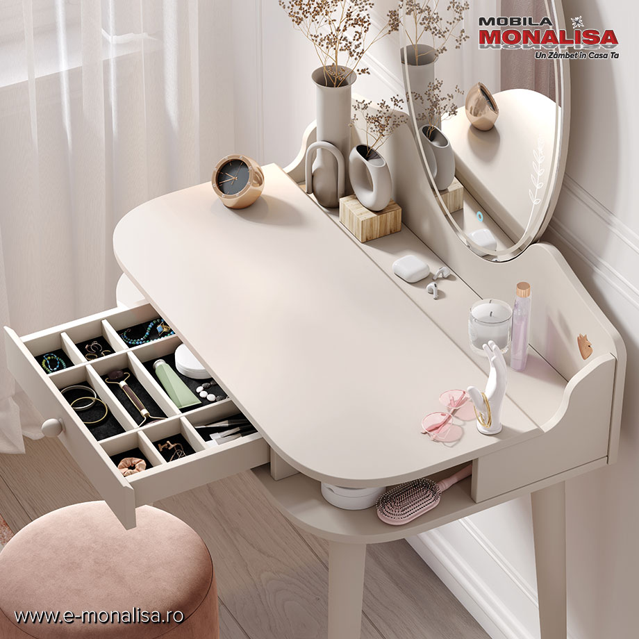 - Masa de Toaleta crem plus Oglinda ovala Elegance – 20.84.1120.00 – spatii de pastrare + sertar cu organizator de bijuterii + oglinda ovala iluminata LED