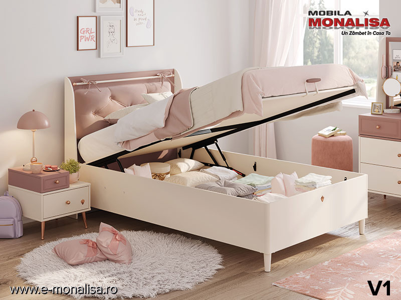 - Pat CU LADA pt. saltea 120x200 cm cu somiera si sistem de ridicare incluse – 20.84.1708.00 – tablia roz pudra cu nasturi si bara – v1