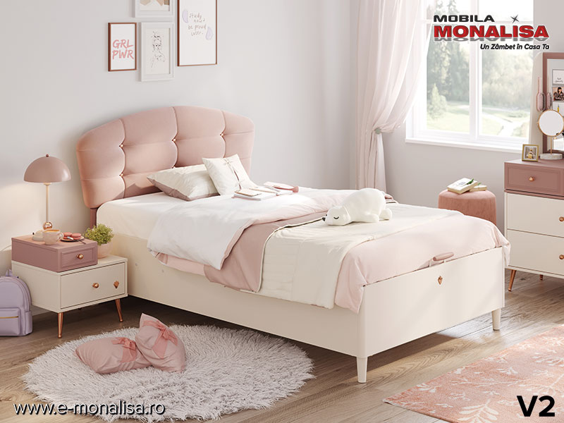 - Pat CU LADA pt. saltea 120x200 cm cu somiera inclusa – 20.84.1710.00 – tablia rotunjita roz pudrat tapitata cu nasturi – v2