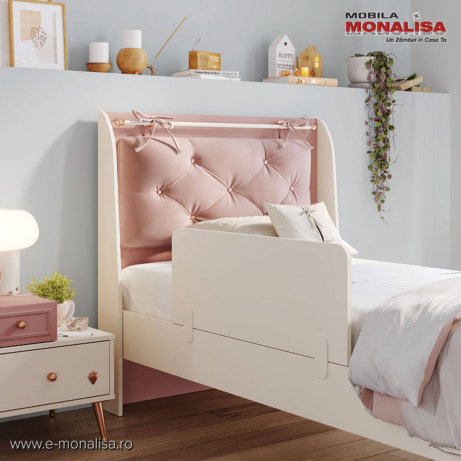 - Pat CU LADA pt. saltea 100x200 cm cu somiera inclusa – 20.84.1709.00 – tablia rotunjita roz pudrat tapitata cu nasturi – v2
