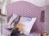 In ambele variante de dimensiuni patul pt. camera copilului Joyful este fabricat pe o structura solida iar tablia patului este capitonata si asortata in decorul general al mobilierului, mov – lila cu bulinute albe.