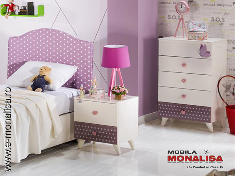 Noptiera cu 2 sertare se integreaza perfect in linia setului de dormitor atat din punct de vedere al utilitatii celor doua sertare cat si din punct de vedere al designului prin frontul placut din sticla mov-lila cu buline albe si maner in forma de inimioara 3D.