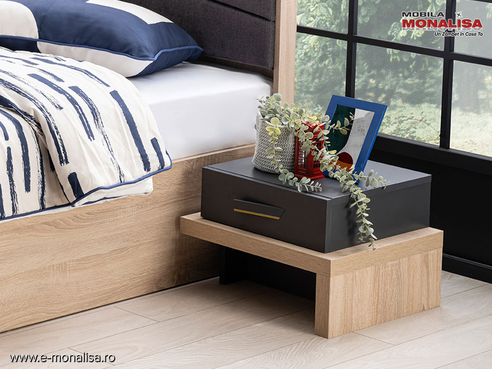 Noptiera cu un sertar New City nu este doar un accesoriu vizual, ci și o soluție de organizare smart pentru zona de odihnă. Designul său cu linii drepte se încadrează perfect în trendul de stil industrial, oferă în același timp spațiul necesar pentru gadgeturi, cărți sau lampa de noapte.