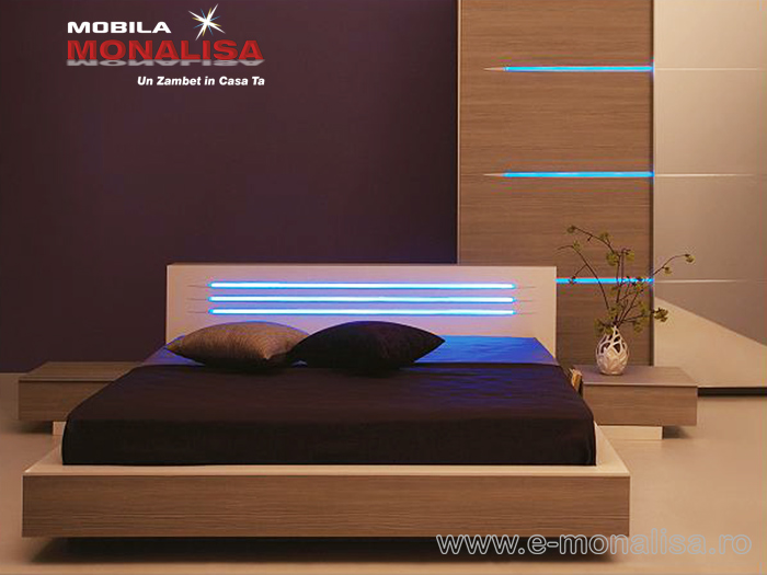 Odata rezolvata rezistenta si fiabilitatea in timp ne-am gandit ca veti dori mai mult design si chiar integrarea patului intr-un aranjament de dormitor feng shui. La comanda dvs. patul poate fi prevazut cu sistem de iluminare a tabliei, sistem ce poate fi comandat si pe usa dulapului de haine atunci cand optati pentru varianta de set mobila dormitor sifonier cu usi glisante. Tot optional putem comanda prin telecomanda aprinderea si stingerea sistemului de lumina LED.