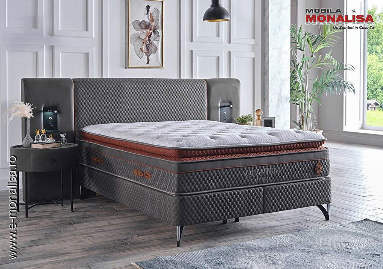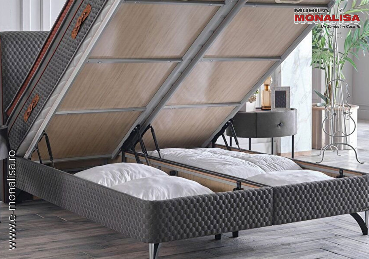 Patul tapitat Quantum Prime este prevazut cu lada pentru pastrarea lenjeriei si somiera pt saltea incluse in pretul patului.