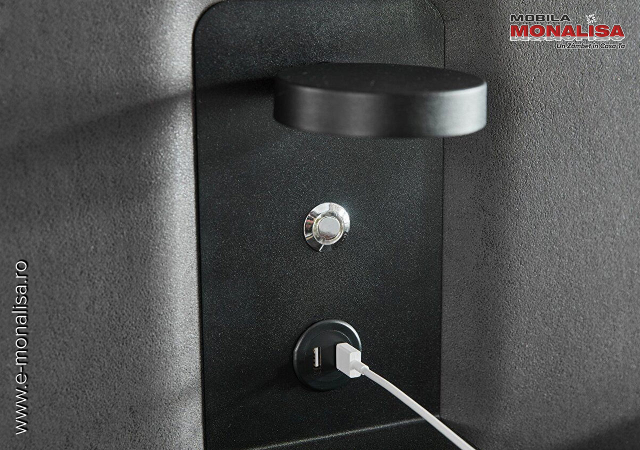 Linia moderna a patului este completata de picioarele metalice iar tabliile tapitate stanga dreapta ce includ sistem de iluminare si porturi de incarcare USB contribuie substantial in obtinerea unui ambient exceptional, nobil si de bun gust.